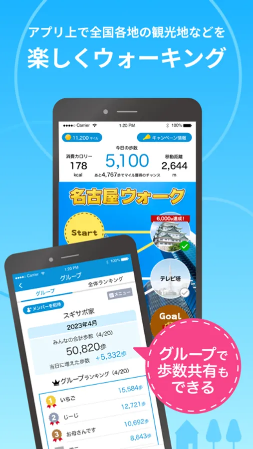 家族や友人でグループを作り、各メンバーやグループ全体の歩数を共有することが可能です。