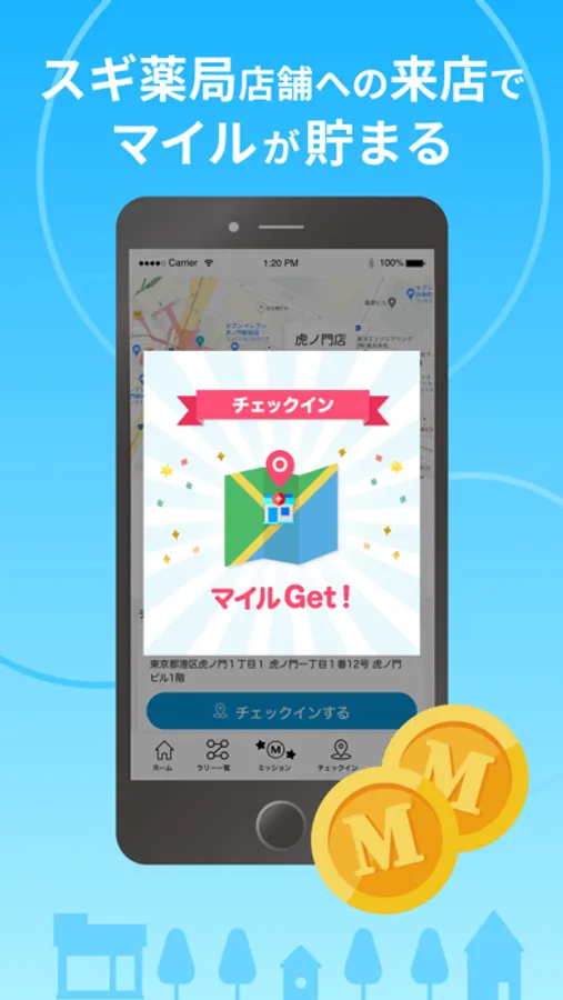 全国のスギ薬局店舗に来店し、チェックインすることでマイルが貯まります