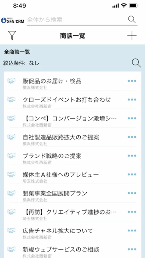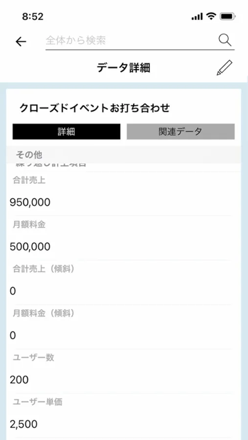 進行中の商談データにアクセスして参照することができます。商談金額や受注日に変更があった時に、出先からスマートフォンで最新情報に更新することができます。