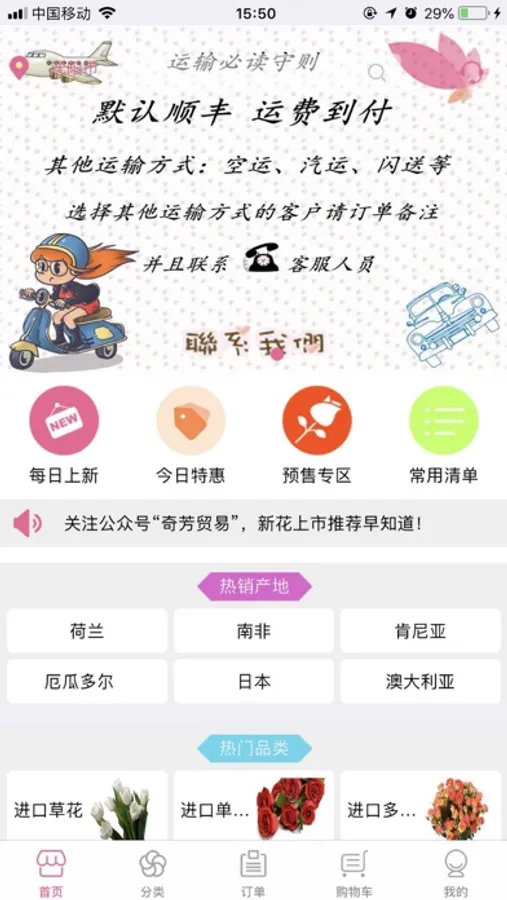 主营荷兰、南非、日本、肯尼亚、新西兰、厄瓜多尔、哥伦比亚、澳大利亚、埃塞俄比亚等各国进口鲜切花及国内各种鲜切花。