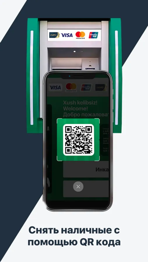 •Снятие наличных без карт Visa, Mastercard, UnionPay, Humo, путем сканирования QR-кода с экрана банкомата.