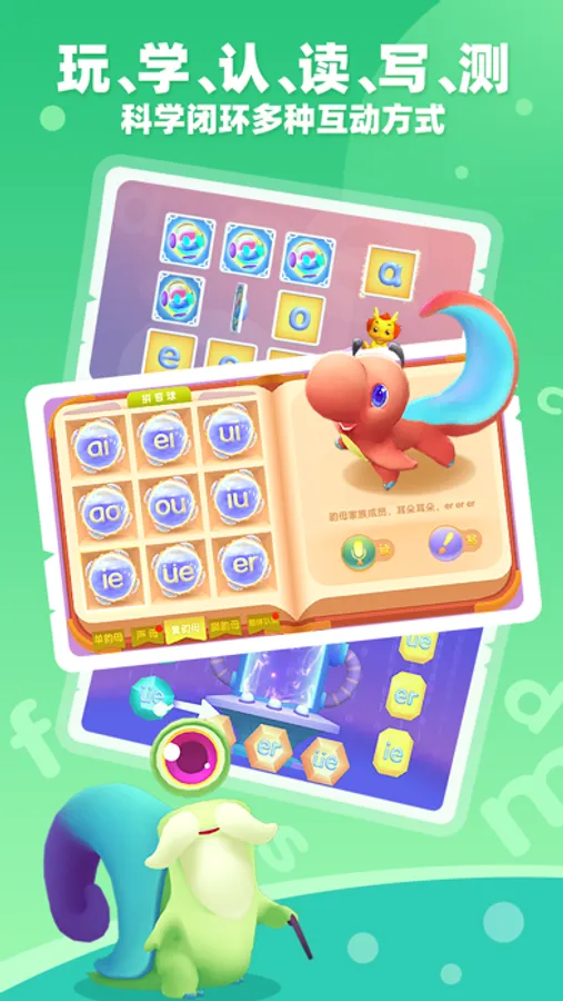 -300+拼音学习互动环节,有趣的拼音认、读、写复习关卡,强化效果。
