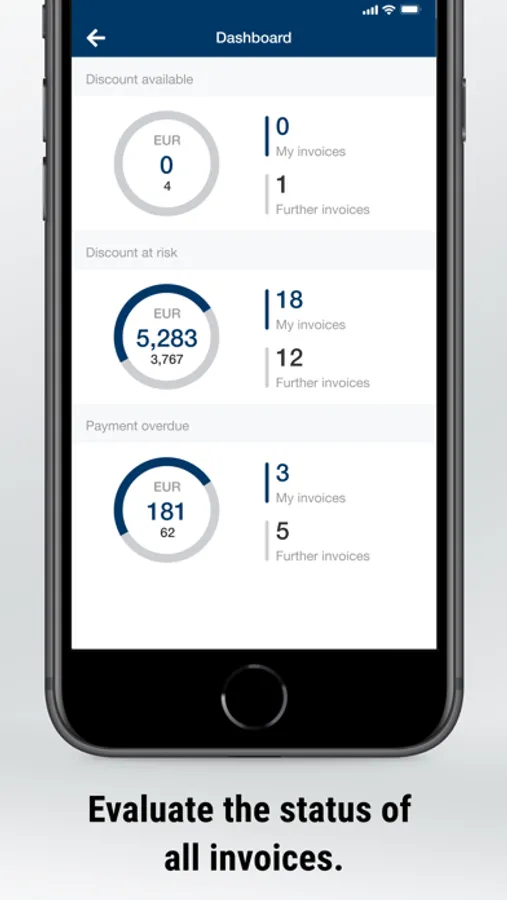 • personal dashboard with warnings: invoices and receipts overdue, imminent cash discount losses, price increases