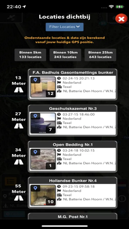 We manage the largest database with bunkers and other war-related locations, we are processing all this in the app and are already at 40.000+ locations, this is about 45% of what we know and also of what comes in (we go with various people almost every day on the road to search and process locations in the app, straight from the dunes, for the best results!).