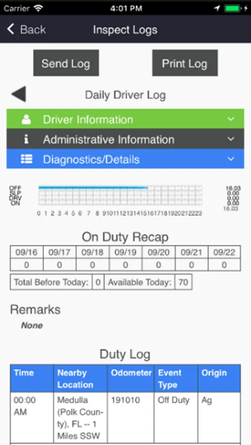 The system puts drivers in complete control, they can add and remove locations, and the system allows for multiple locations of commodity pick up or drop off, which roll continually onto logs until removed, all follow the posted FMCSA rules including the complex A,B,C pick-up/drop-off, en-route empty to source, return empty, and other scenarios as published.