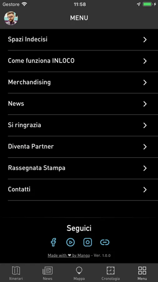 - The app is accessible only upon registration, that can be completed through Facebook or by inserting the requested information in the field “registrati”.