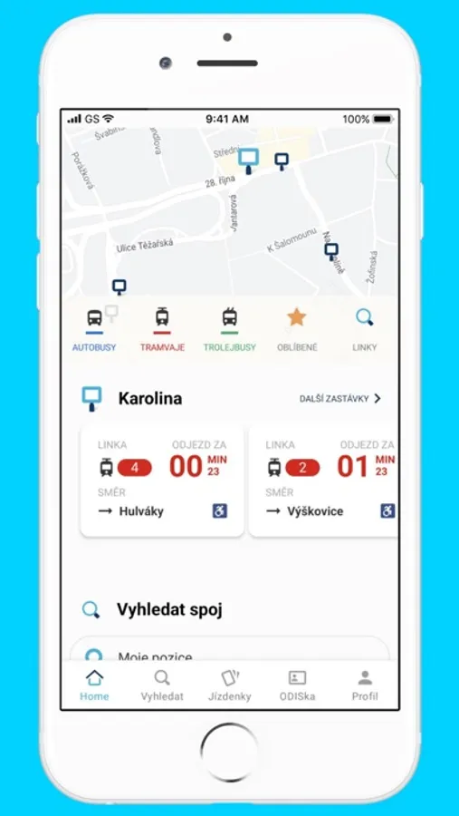 - Zobrazení nejbližší zastávky a odjezdů z ní.