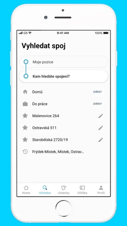 - Přednastavení zastávky „Domů“ a „Do práce“.
