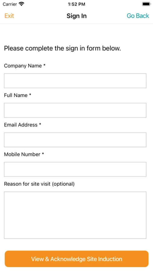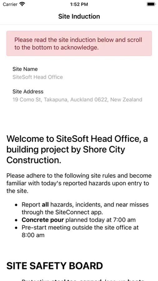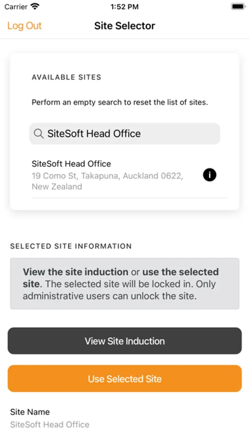 SiteConnect Visitor Kiosk is a tablet app within the SiteSoft app suite to keep track of contractor, employee and visitor access to sites. A site-specific induction is displayed to the contractor, employee or visitor, prompting them to read and acknowledge the induction. Access records can be viewed from the the SiteConnect web portal at https://app.sitesoft.com/