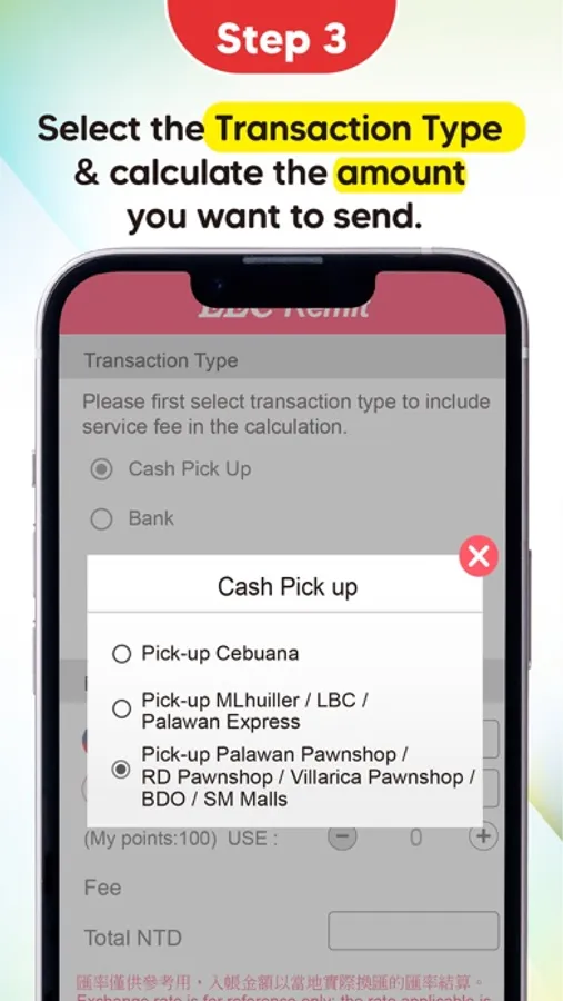 * Cash Pick-up at Cash pickup outlets or major banks (MLhuillier, Cebuana, Palawan Pawnshop, SM Outlets, BDO, Metrobank).
