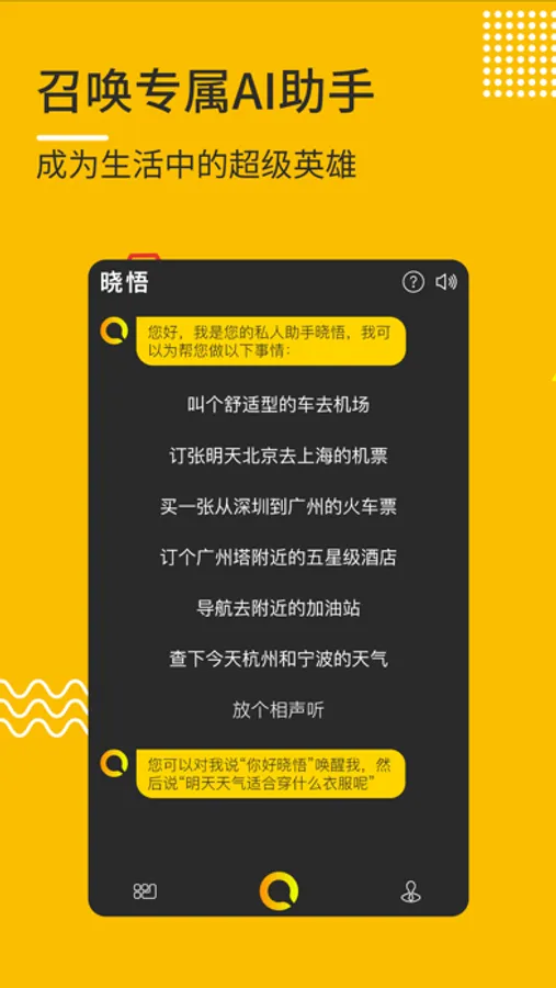 功能实用:打车、导航、订机票、订酒店、订火车票、买电影票、充话费、跑腿、查天气、打电话、星座运势、语音交互小说,以及海量优质音频内容,你想要啥【说】就行了,晓悟统统满足你!