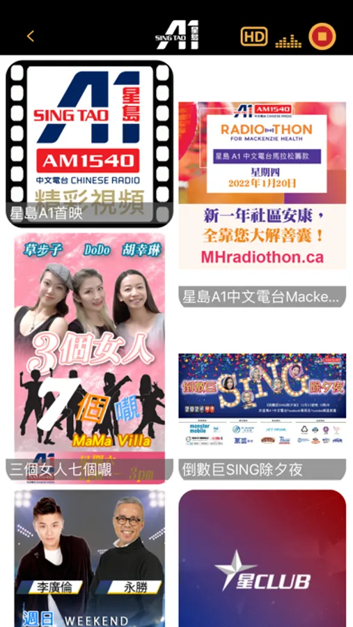 星島A1中文電台每周以國粵語廣播超過70小時。節目內容包括新聞專輯,時事報導,主持訪談,音樂生活,娛樂等等。強大的節目主持陣容讓本台成為多倫多最受歡迎電台之一,吸引了廣大忠實聽眾。
