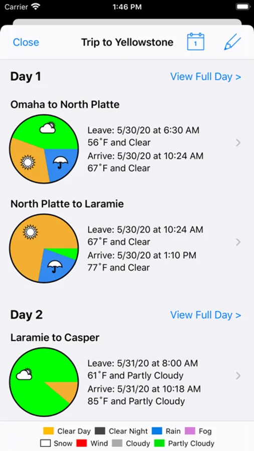 • View a detailed breakdown of the weather for each trip, grouped by route segments (from one stop to the next) and days.