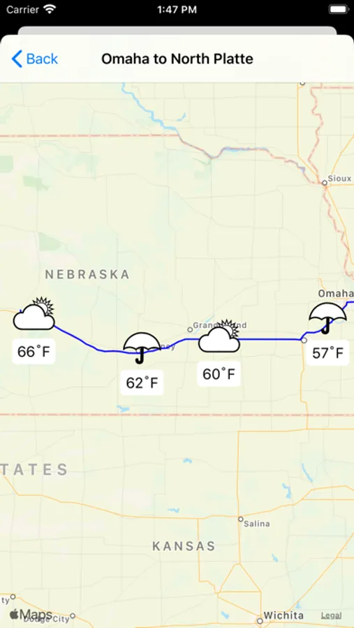 • View each route segment or day on a map, with the weather condition and temperature overlaid at various locations.