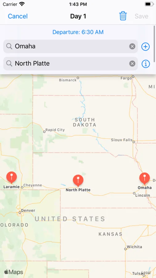 • On each day of travel, set the start and end locations and as many rest stops as desired.