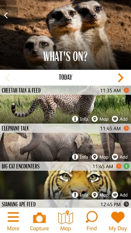 - Check out What’s On to see the latest schedule for Zoo Feeding Times, Keeper Talks and Animal Encounters. Never miss a Talk or Tour! Just add them to My Day.
