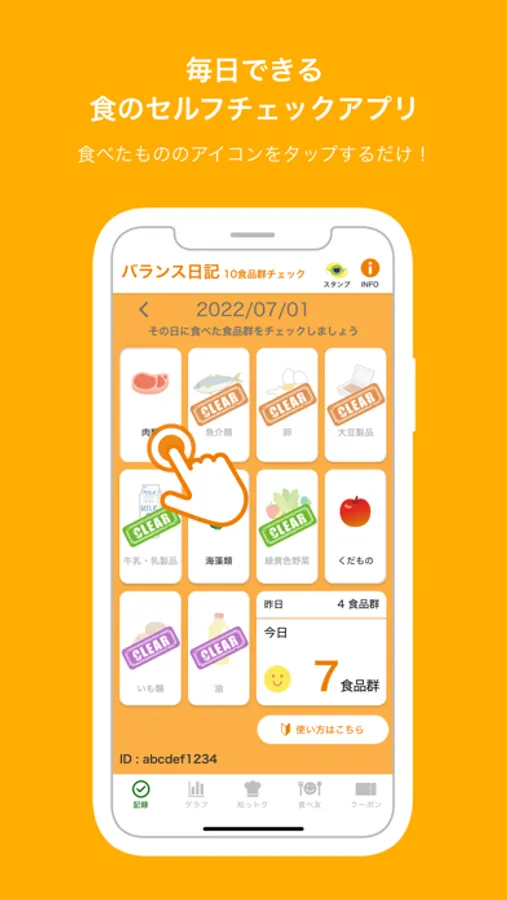 これ一つで食のバランスやBMIのチェック、そして簡単フレイルチェックもできる健康サポートアプリです。続けやすさを重視したとてもシンプルな作り食のバランスを整えるはじめの一歩として、10食品群チェックにチャレンジしてみてください!