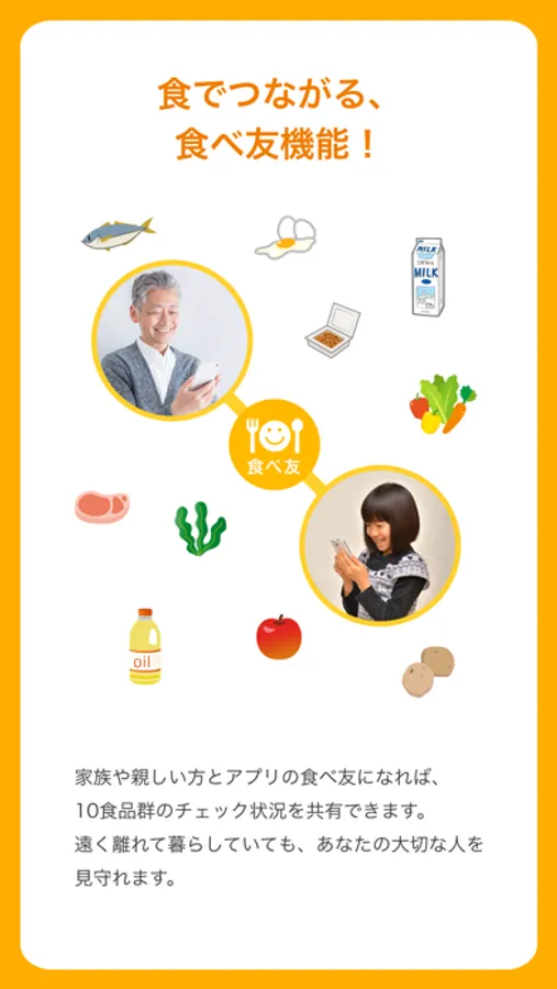 例えば「ちゃんと食べて、元気に過ごしているかな?」と心配されている家族や友人と10食品群チェックで常につながることができる機能です。遠くに住むご家族のことも、食のチェックで一安心。
