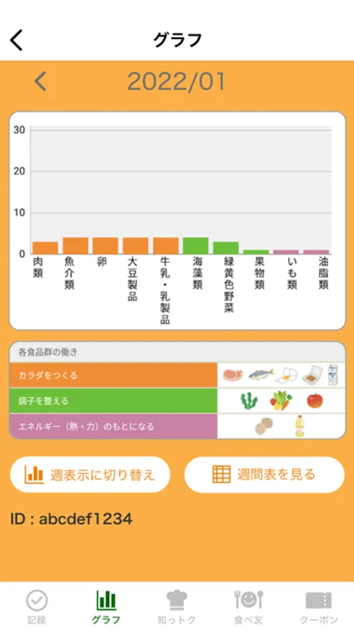 毎日主食以外で食べたものをアイコンに沿ってタップします。タップした記録が残り、グラフや表で自分の食生活や不足しがちな食品群が一目でわかるようになっています。