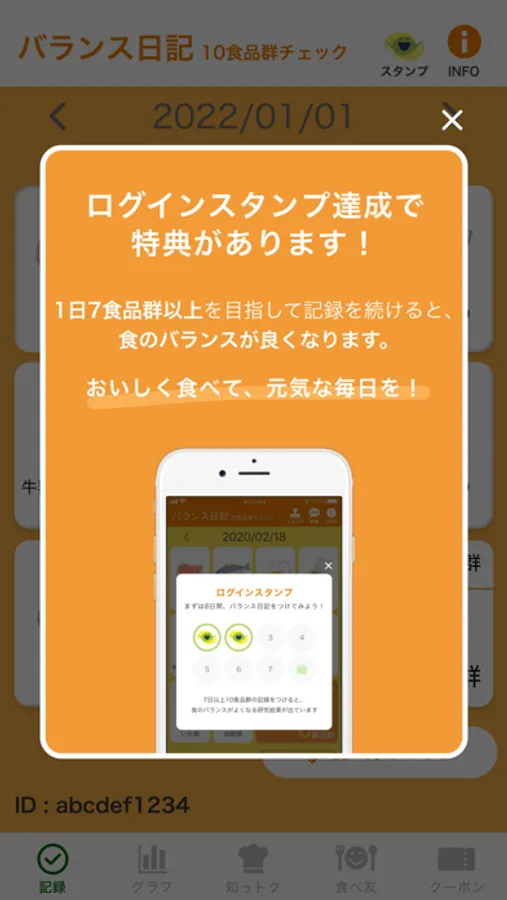 バランス日記は、1週間以上使うと食のバランスが改善傾向になり、3週間以上続けると習慣化につながることが研究で分かっています。バランス日記を楽しく続けて頂くため、ログインスタンプを集めると、クーポンや特典をプレゼント。毎日の食事記録を続けて食のバランスを改善。更に、お得な情報を手に入れることができます。