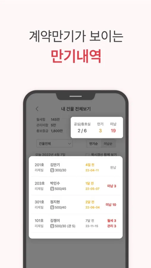 다가오는 계약만기일을 확인하고 공실을 대비하세요.