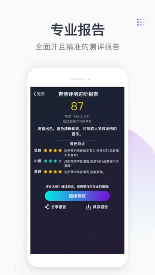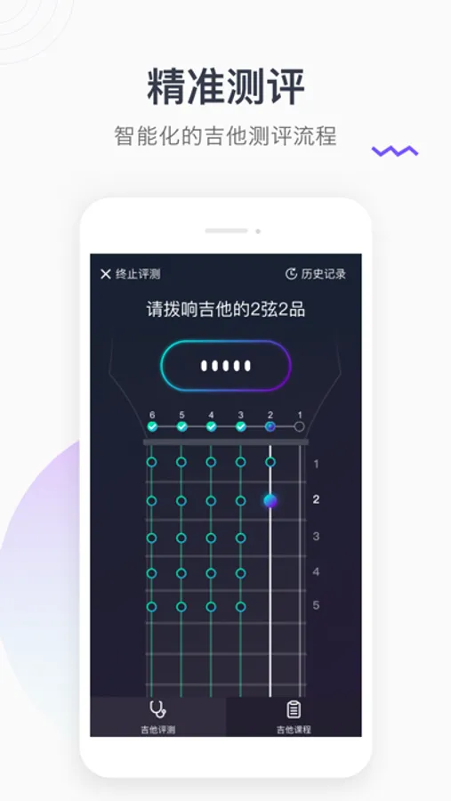 精确到具体每一弦每一品,全面准确测试,智能化的吉他测评,流程简单方便,语音引导测试,新手也可快速掌握。