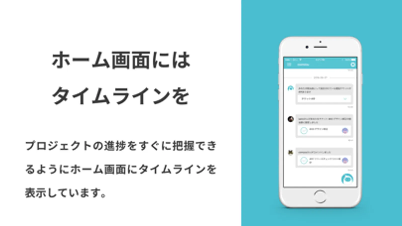 Commuはプロジェクトの進捗をすぐに把握できるようにホーム画面にタイムラインを表示しています。アプリを開いたらまずはプロジェクトの進捗を確認してみましょう。