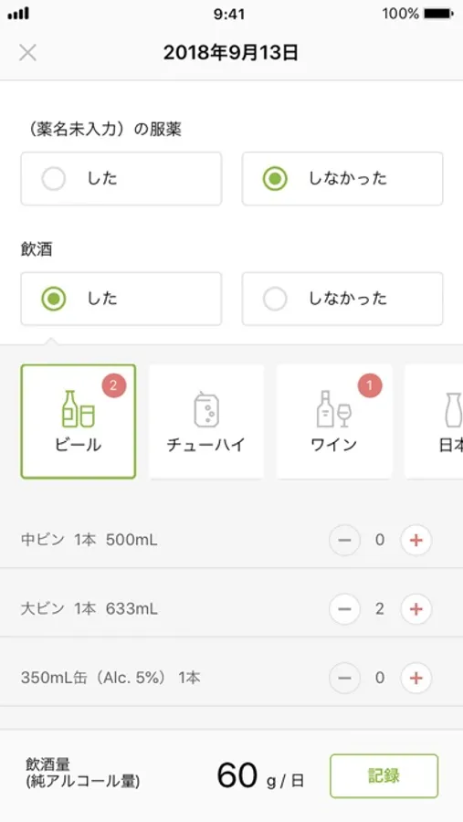 日々の飲酒量や服薬を記録して「減酒治療」をサポートするアプリです。
