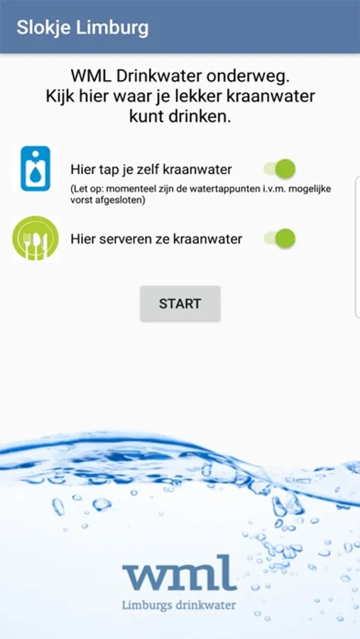 WML Drinkwater onderweg. Kijk in deze app waar je onderweg lekker kraanwater kunt drinken in Limburg. Zelf tappen aan een watertap, of in horeca-gelegenheden die drinkwater serveren.