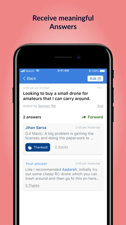 Swipe up and down and find relevant questions to gain network insights and get credible knowledge. Get relevant updates back as your network shares answers. You can even share your favourite answers with your friends on social media & Whatsapp.