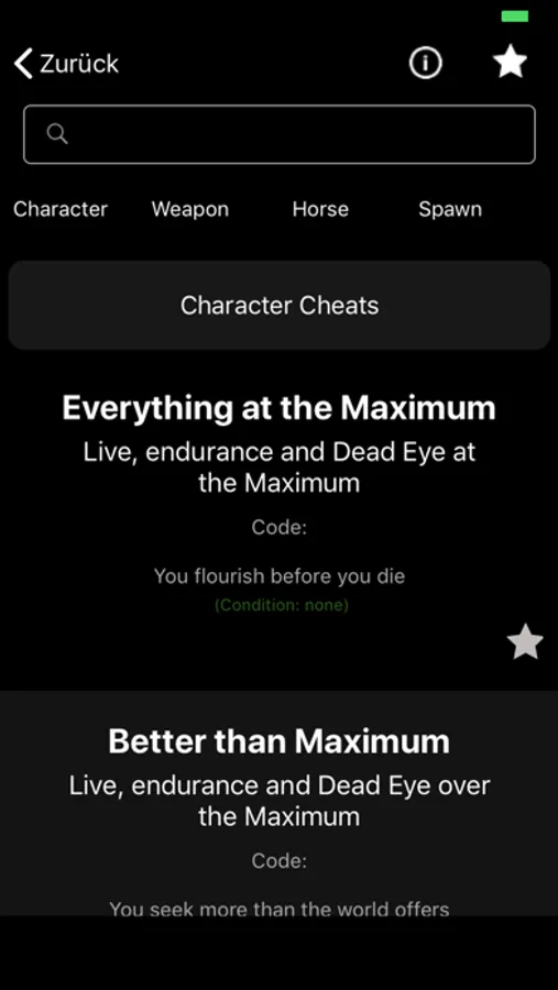 An unofficial app for Locations, Hints, Cheat Codes and more for RDR2. This app should increase the fun level beside completing missions. With this app you can easily access cheat codes or hints for Red Dead Redemption 2 from Rockstar Games during playing the game. You can search for cheats, or mark them as favourite, and only display these ones. Additionally it points out some interesting spots on the map.