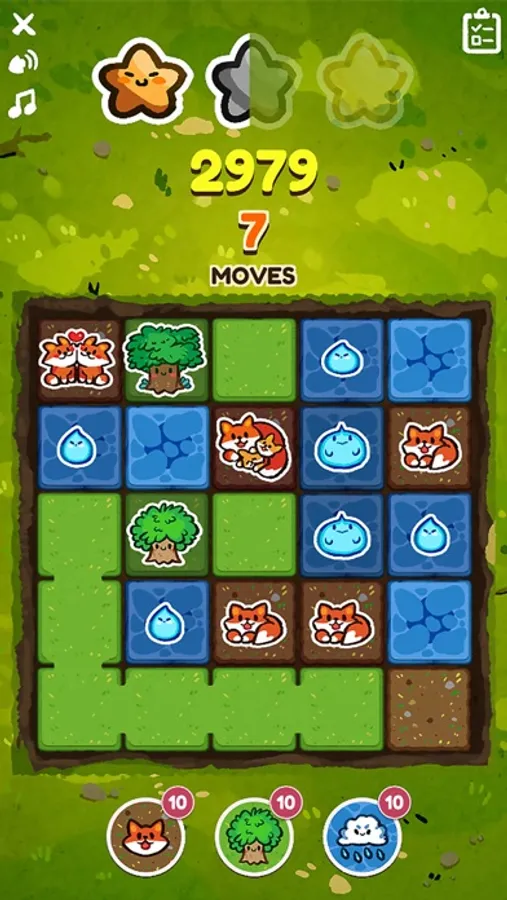 Each level has three super cute resources. Green tiles will transform into luscious into trees that will eventually grow into mature forests. Blue tiles will condensate into water droplets that hydrates the soils, plants, and animals of the forest! Brown tiles will birth Kits (baby foxes) that will eventually start a the cutest fox family you have ever seen! Keep your eye on the number of moves left each round to develop the best foresting strategy. Newly merged tiles can be further combined in sets of 3 to continue to mature the landscape.