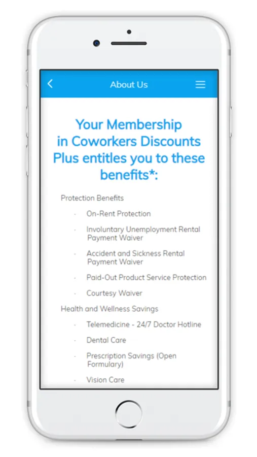 An app for members of Coworkers Discounts Plus program. The app will connect members securely to their discounts and benefits and provide valuable information about the program and how to use it.
