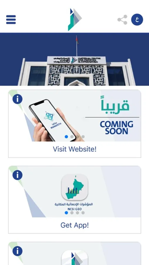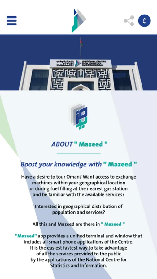 " Mazeed" app provides a unified terminal and window that includes all smart phone applications of the Centre. It is the easiest fastest way to take advantage of all the services provided to the public by the applications of the National Centre for Statistics and Information.