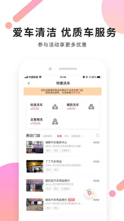 一张洗车券,多品牌养车门店全国通用,APP内一键导航附近洗车门店;