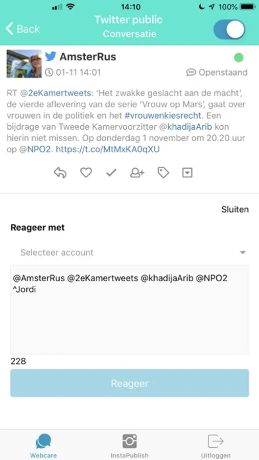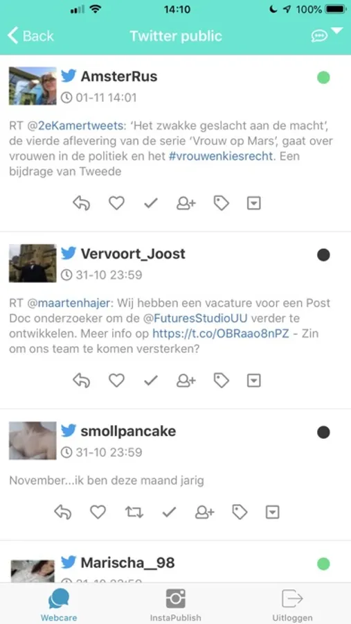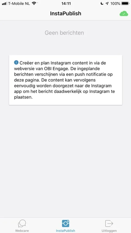 You can use the OBI Engage app to manage your webcare easily, real-time and in sync with the web version of OBI4wan. Also you can easily publish and schedule your content for Twitter, Facebook, Linkedin and Instagram. The app has been completely rebuilt and has the look & feel of the desktop webcare module.