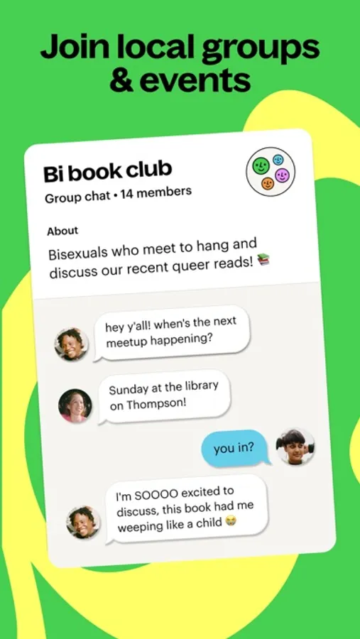 - Join or create a group - chat with local LGBTQ+ community around a shared interest, hobby, or activity