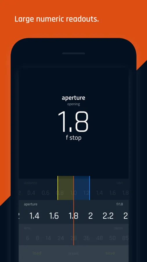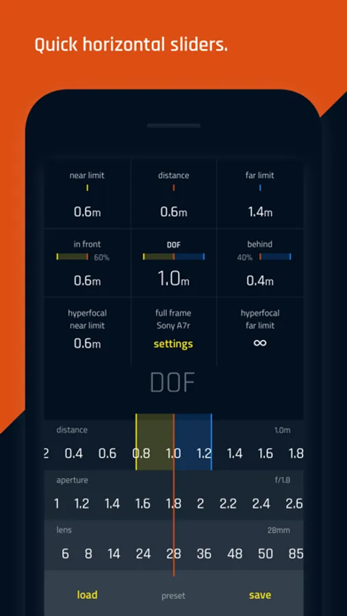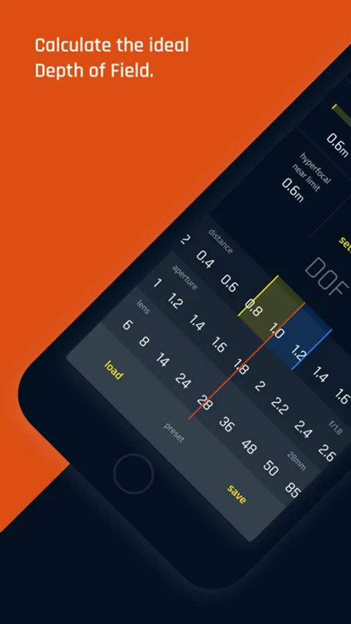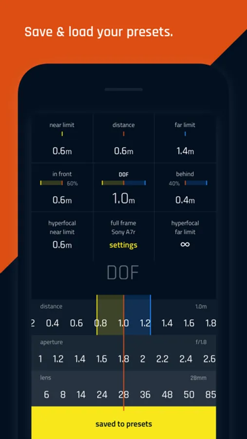 Calculate the ideal Depth of field with three simple sliders for distance, aperture, and lens. Got your perfect settings? Great! Now save it for future projects, ready to be loaded any time you need it.