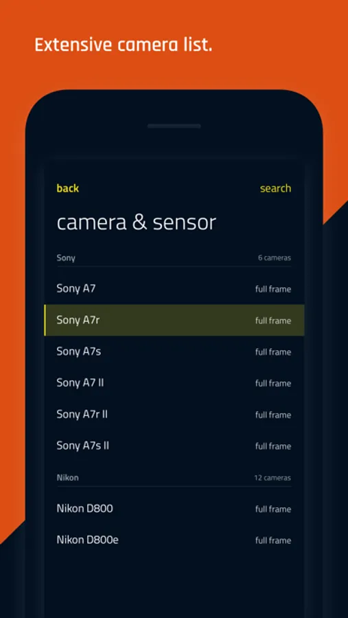 Cameras are plentiful. DOF features hundreds of camera models from Sony, Nikon, Canon, Fujifilm, Kodak, Konica, Leica, Minolta, Olympus, Panasonic, Pentax, Ricoh, Samsung, Sigma as well as Hasselblad, Leaf, Phase One and Mamiya. Larger film formats include 6x4.5, 6x6, 6x7, 6x9, 4x5, 5x7, 8x10 and cinematographic formats like Super 16, Super 35 are also available. Plus a full list of Circle of Confusion values.