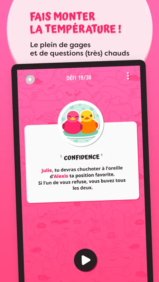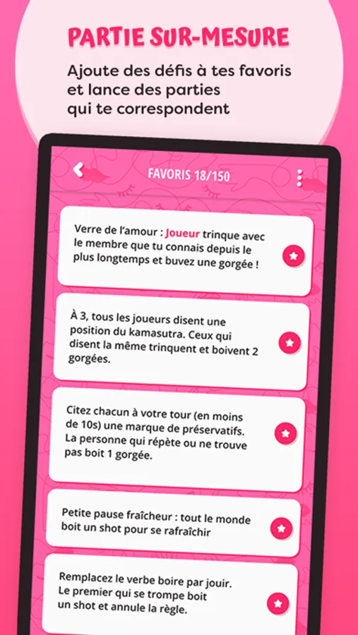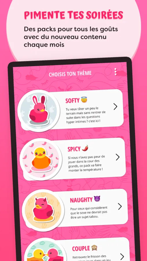 L’ application contient des centaines de gages et de défis pour celles et ceux qui veulent passer une soirée/nuit inoubliable. Sur Kinky, il y en a pour tous les goûts. D’ailleurs, l’application s’adapte à l’ambiance grâce à ses différents packs de jeu :