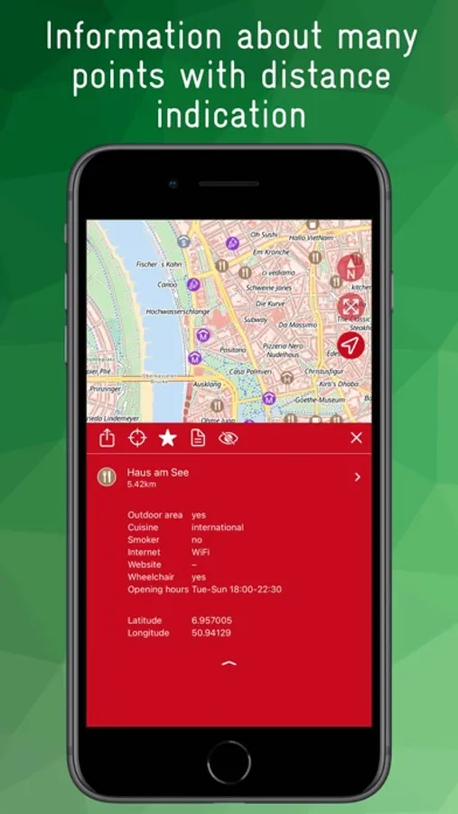 For many POIs there is further information such as opening hours, address, disabled access, ... Notes or favourites can be created for each POI, a history list shows the most recently used POIs, content can be shared.