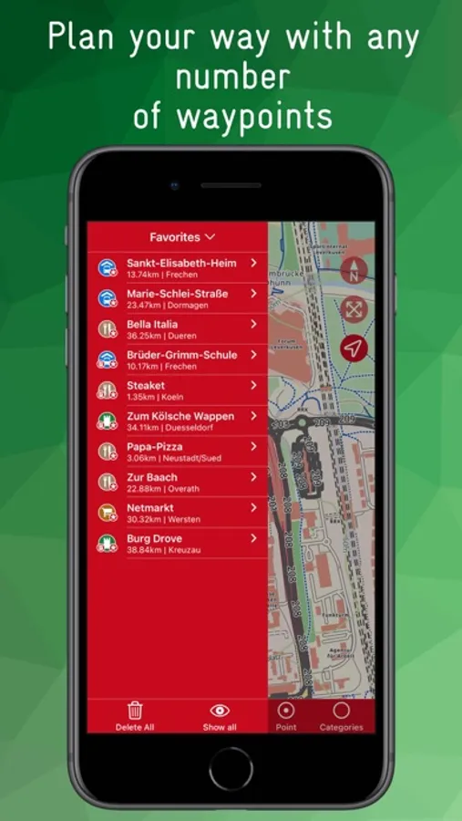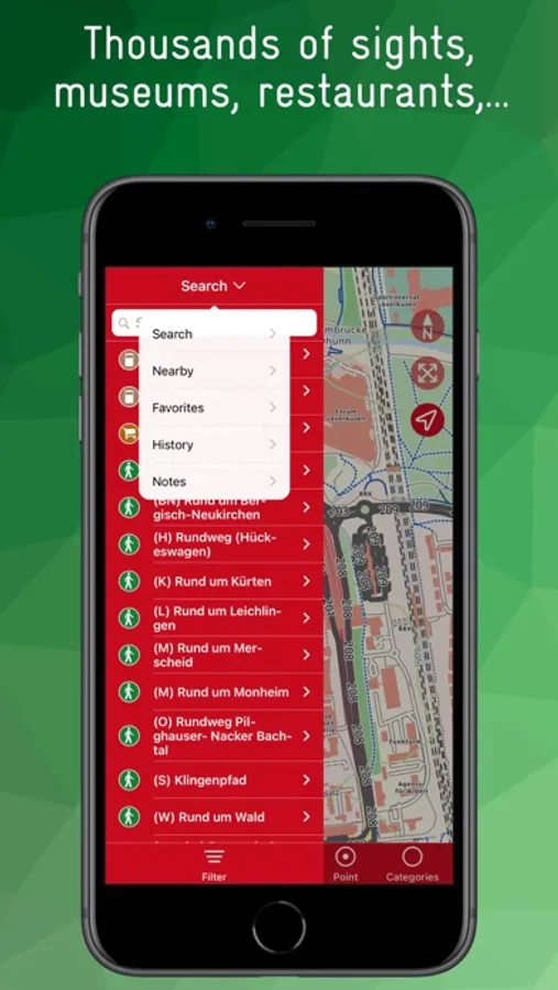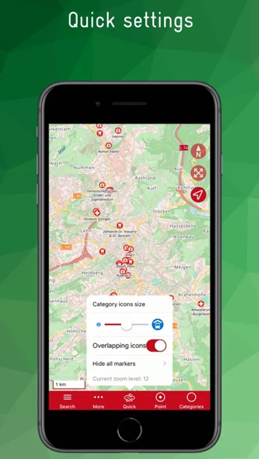 POIs are grouped into categories and can be displayed as layers. For example, you can display all restaurants, public transport lines, banks, hiking trails, charging stations and doctors on the map. The size and overlap of the icons can be adjusted to improve clarity.