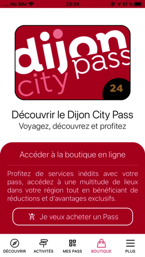 Si l’utilisateur dispose d’un Dijon City Pass, il peut l’enregistrer dans l’application en saisissant son numéro unique sur dix chiffres. Il a alors accès aux informations relatives à son City Pass : date de validité, lieu d’achat, QR code, liste des prestations disponibles et état de consommation (sous réserve d’une synchronisation avec le serveur).