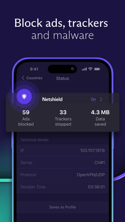 • Ad blocker (NetShield): a DNS filtering feature that protects you from malware, blocks ads, and prevents website trackers from following you across the web