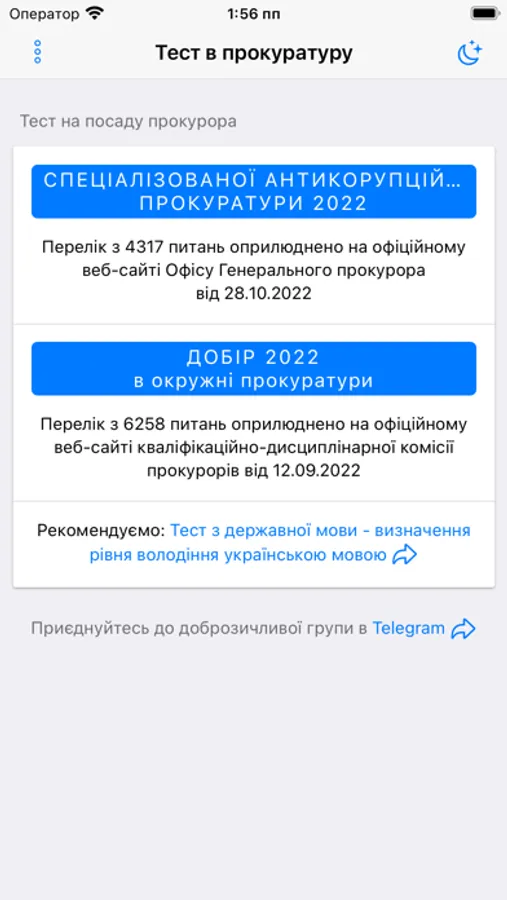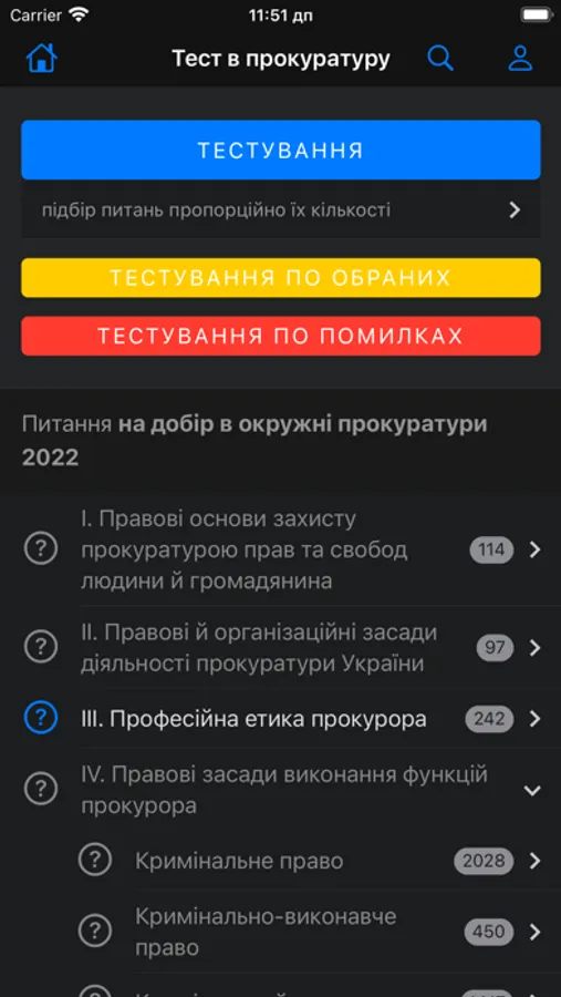 - Тестування по питанняx будь-яких обраних розділів: підряд, випадково або за важкістю (визначається за статистикою проходження тестів усіма користувачами додатку);