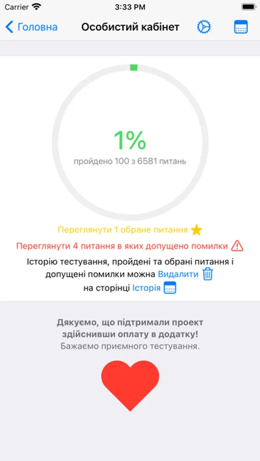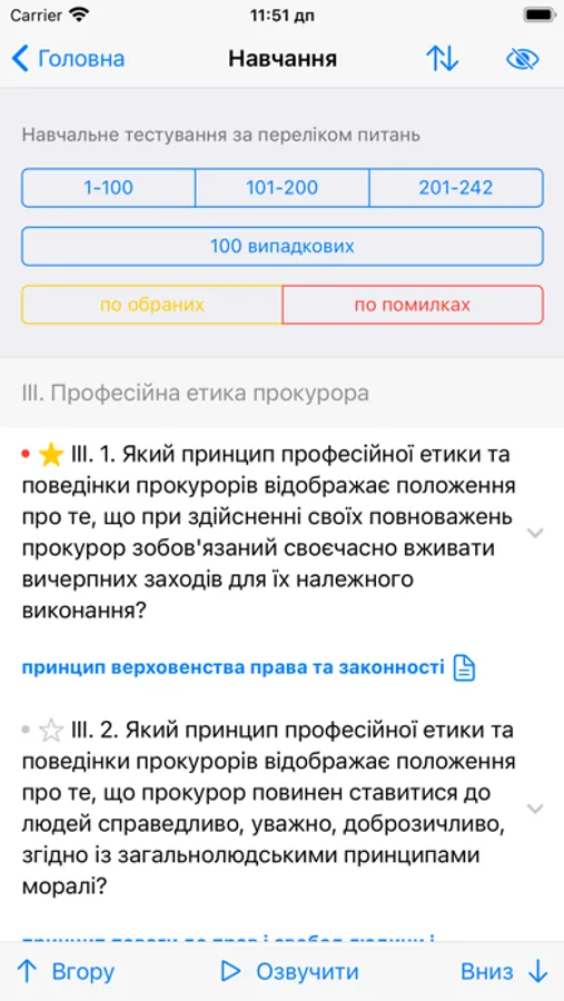 - Можливість додавання питань в "обрані" та проходження по них окремого тестування;