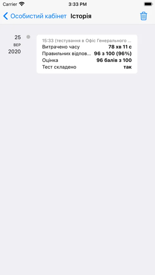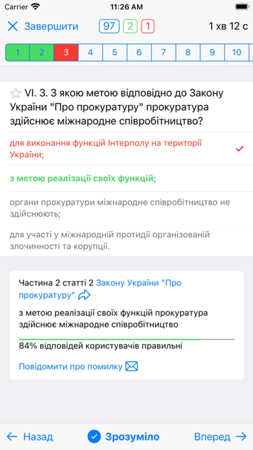 - Випадкове і пропорційне формування пробного тесту на 100 питань (за принципом офіційного іспиту);