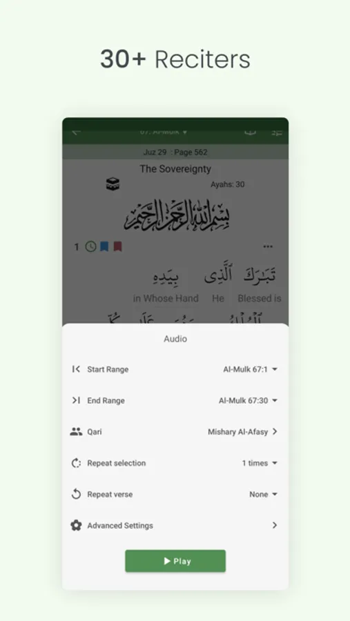 ● Listen to several recitations by 30+ reciters (downloadable for offline use)