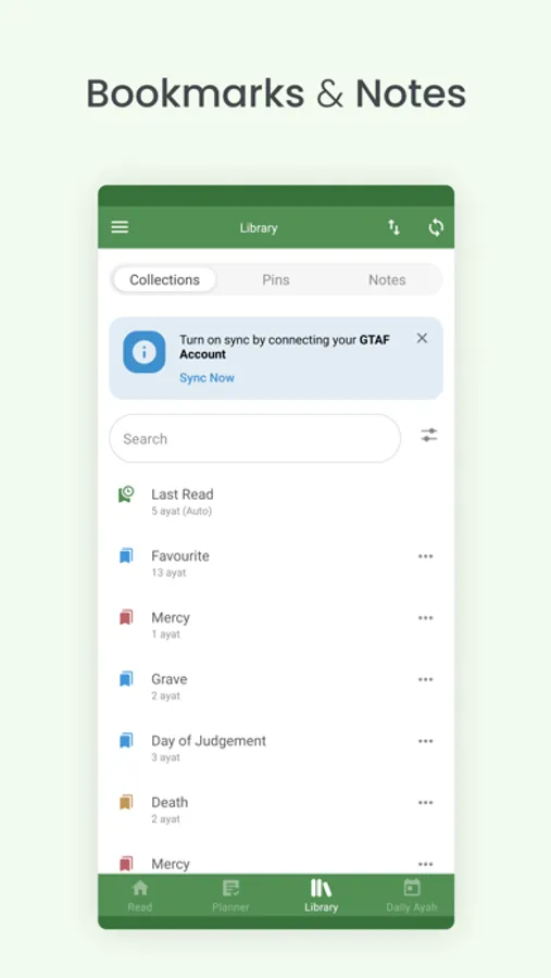 ● Bookmark ayahs to your own Collections and keep track of the last read ayah using Pins