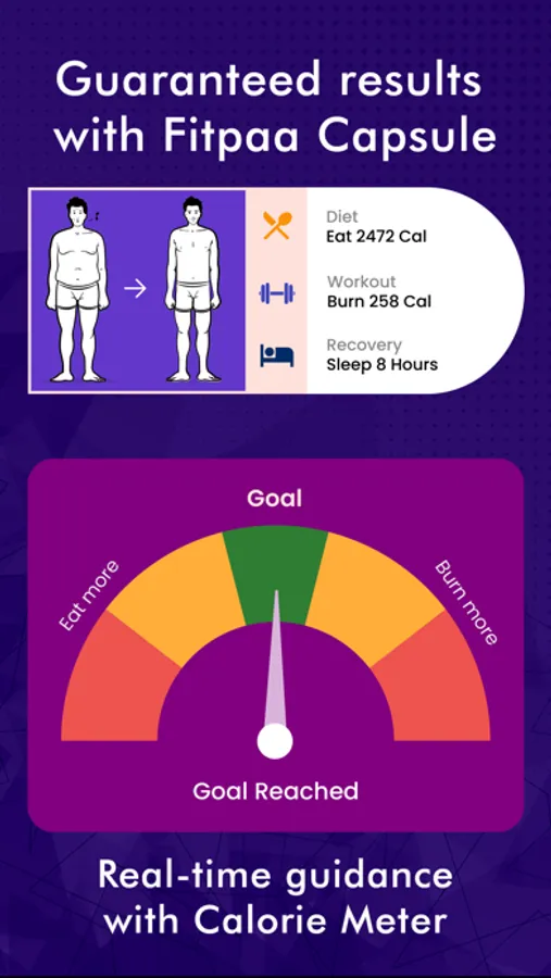 Fitpaa app makes it easy to follow your Fitpaa Capsule. Once you open the app, you’ll see a Calorie Meter just below your Fitpaa Capsule. All you have to do is to get the pointer to green by the end of the day. Calorie Meter gives you real-time guidance on the number of calories you have to eat or burn at any point of time during the day to move to green. For best results, follow your capsule with precision diet tracker and smart workout trainer.